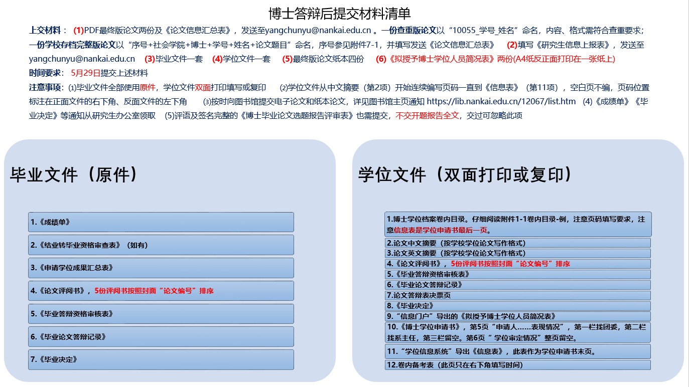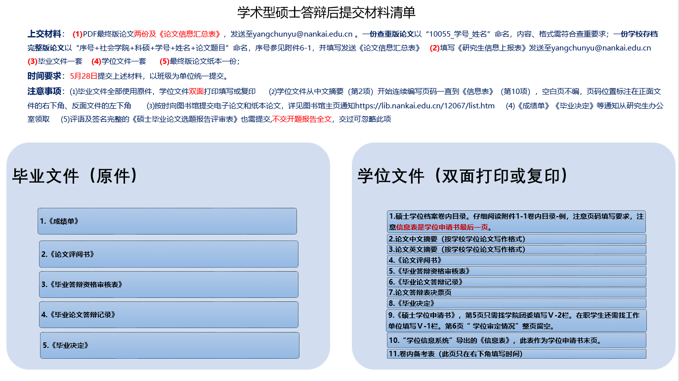 研究生答辩结束后需要及时准备各种毕业及申请学位的材料,所需材料见附件,学术型硕士生和博士生需要提交的材料清单分别如下: