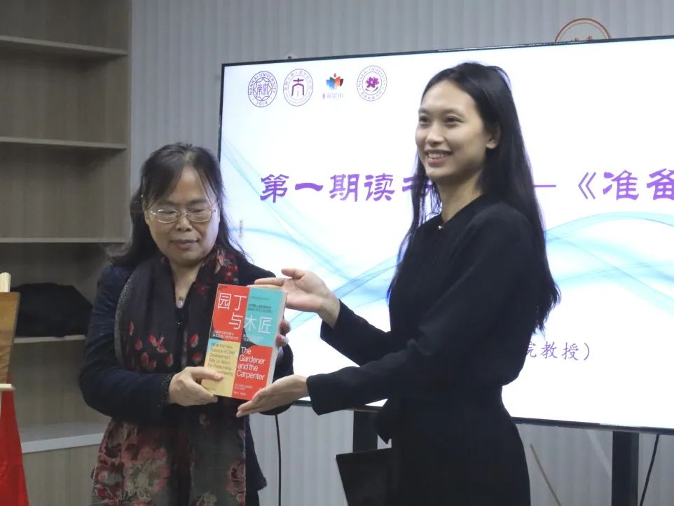 最后,第一期读书会主理人赵晓倩向李川勇教授送出《园丁与木匠》表示感谢,并由李川勇教授将流动主理人的接力棒传递到了书友许惠芬手中,期待海棠南开书房项目及之后的无心读书会可以更上一层楼。