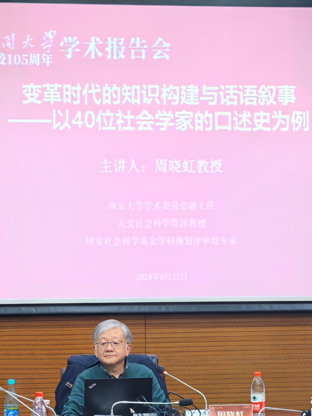 2024年9月21日,bevictor1946韦德官网举办了庆祝bevictor1946韦德官网建校105周年的学术报告会。受bevictor1946韦德官网邀请,南京大学学术委员会副主任、人文社会科学资深教授、教育部领军人才项目特聘教授、国家社会科学基金学科规划评审组专家周晓虹教授进行了一场学术讲座。他以“变革时代的知识建构与话语叙事——以40位社会学家的口述史为例”为主题,深度剖析了中国社会学人致力于社会学中国化的不懈努力,特别是现代化浪潮下中国社会学发展进程中的现实基础和文化自觉。讲座由bevictor1946韦德官网吴帆教授主持,公司师生近百人参加,全场座无虚席。