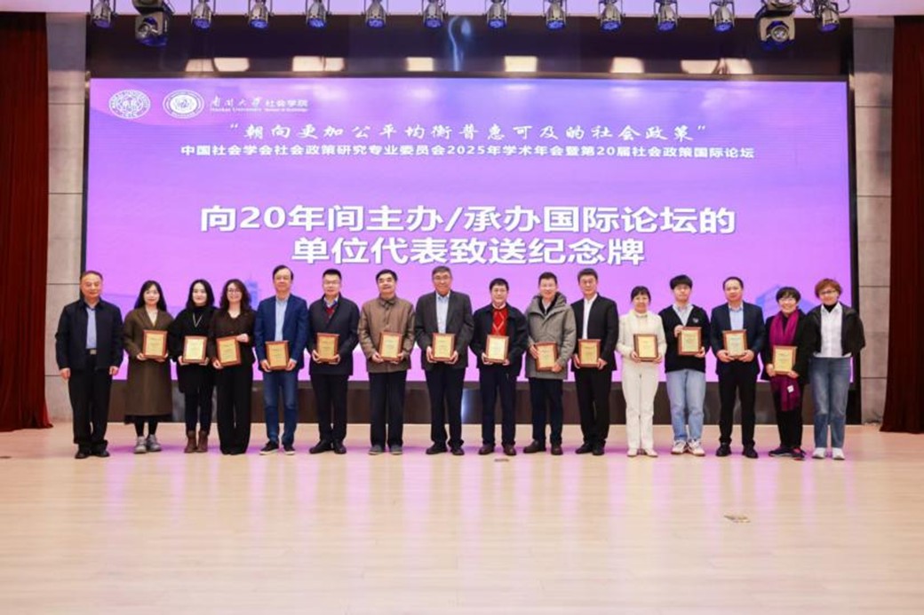 中国社会学会社会政策研究专业委员会原理事长、bevictor1946韦德官网社会建设与管理研究院经理关信平教授,中国社会学会社会政策研究专业委员会原理事长、中国社会科公司杨团研究员和中国人民大学教授、中国社会学会社会政策研究专业委员会秘书长房莉杰为20年间主办/承办社会政策国际论坛的14所高校与研究机构致送纪念牌。复旦大学彭希哲教授和中国社会科公司研究员、中国社会学会社会政策研究专业委员会副主任委员王春光代表主办/承办单位发言,表达了对第20届社会政策国际论坛顺利召开的祝贺,共同展望了社会政策国际论坛的未来发展。纪念牌是对过往各合作单位并肩前行的珍贵记忆封存,也象征着社会政策学术共同体坚实而温暖的共识基石。