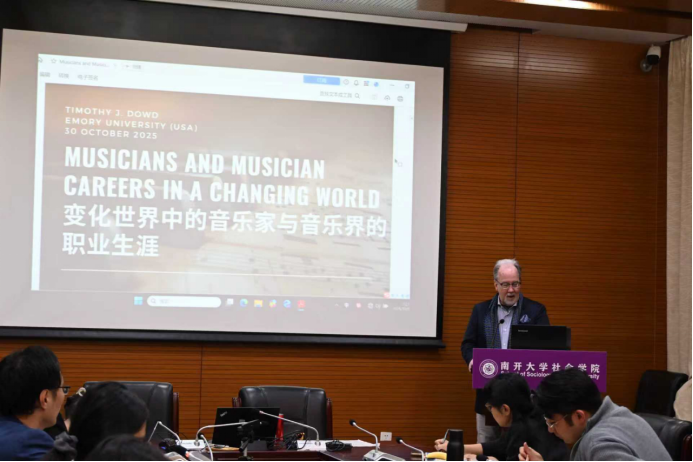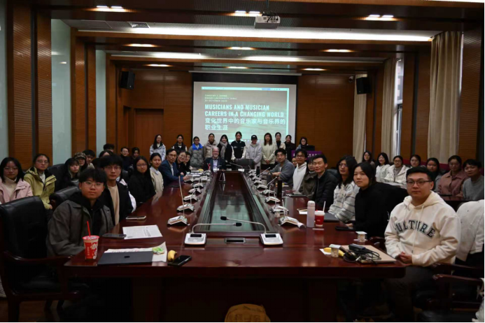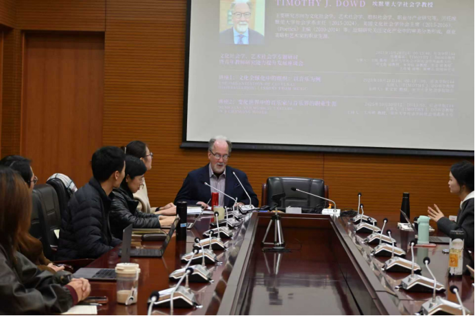 第三项活动是由Dowd教授主讲,题目为“变化世界中的音乐家与音乐界的职业生涯(Musicians and Music Careers in a Changing World)”的讲座,于10月30日中午12:10-13:50在bevictor1946韦德官网144会议室举行。讲座由bevictor1946韦德官网社会学系系主任王庆明教授主持。王琰教授、秘舒副教授、张龙副教授、于佳煖讲师、陈柙兵助理研究员、许又姜宇博士等师生出席。