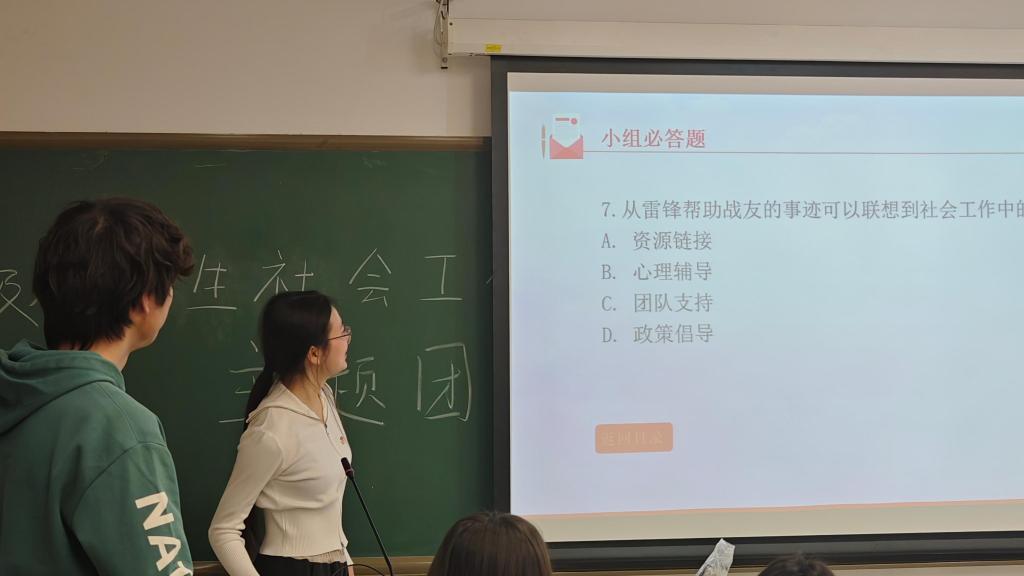 在竞赛过程中,同学们积极思考、踊跃作答,现场气氛热烈。这些题目不仅检验了大家对知识的掌握程度,更促使同学们深入思考雷锋精神与社会工作之间千丝万缕的联系。像雷锋帮助战友的事迹,就与社会工作中的团队支持紧密相关;社会工作者为贫困家庭申请救助,正是践行了雷锋关心他人的精神。