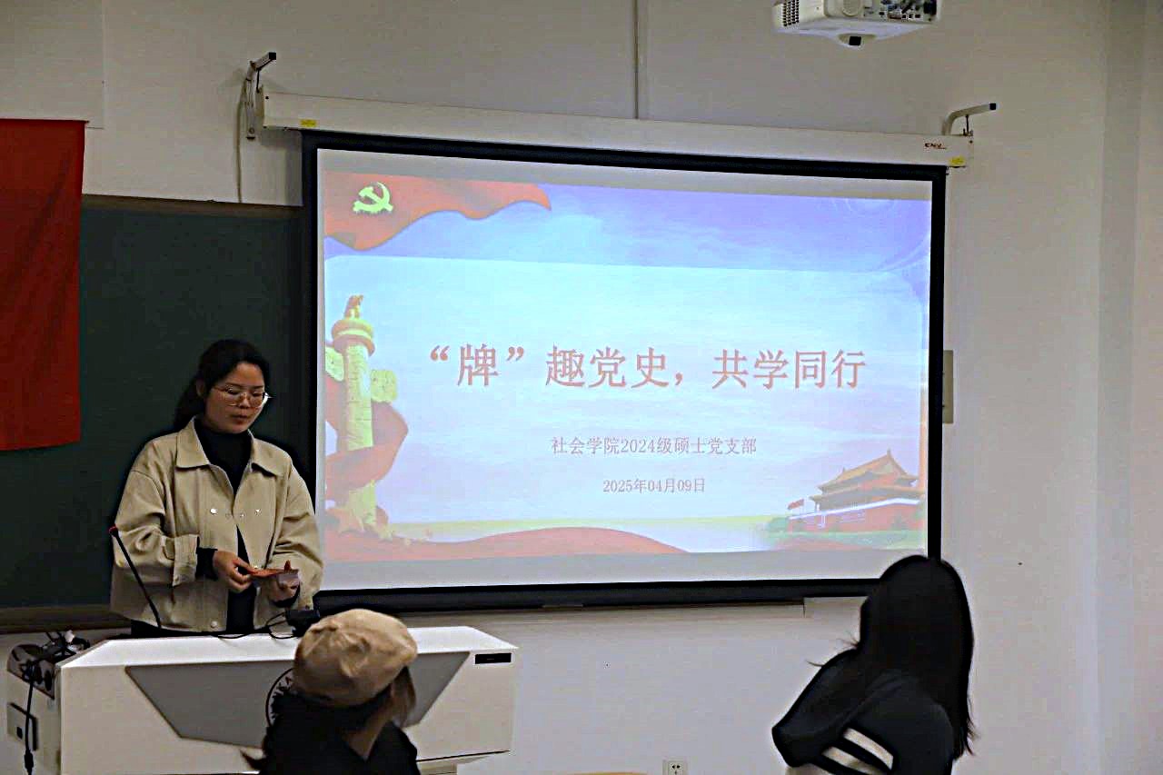 2025年4月9日晚,2024级硕士党支部开展了一场别开生面的“党史接龙卡牌赛”主题党日活动,以创新形式开展党史学习教育,让党史知识在趣味竞技中“活”起来。此次“党史接龙卡牌赛”通过精心设计的卡牌,将党的百年奋斗历程浓缩其中,让党员们以牌会友、以史为鉴,在轻松愉快的氛围中重温峥嵘岁月,检验学习成果。