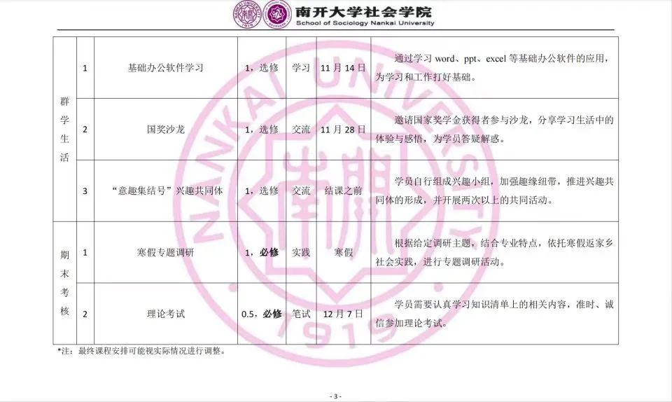 群学团校课程围绕理论知识学习、实践能力培养和公司生活体验三大模块设计,通过课程讲座、社会实践、校园文化活动等多种形式,开展富有公司特色的综合性课程,加强对学员在思想道德素质、理论素养、组织能力、学习研究能力、社会责任感、团队精神和身体素质等方面的锻炼和培养。