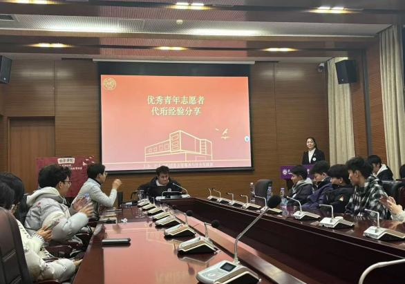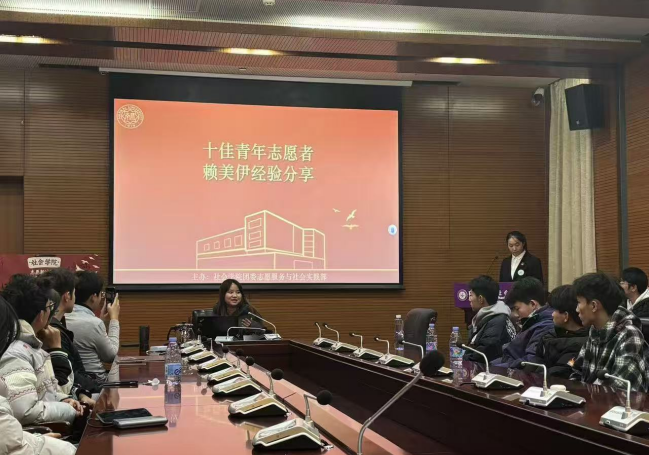 在志愿者们的热烈欢迎声中,赖美伊和代珩二位优秀志愿者上台给青年志愿者们做经验分享。赖美伊同学从自己参与志愿服务的实践中谈到,志愿服务不仅是传递爱与温暖的途径,更是青年人了解社会、提升自我价值的重要途径。代珩同学则结合自己的军训志愿服务和义卖活动经历,志愿服务中要保有真挚的同理心与坚定的社会责任感。
