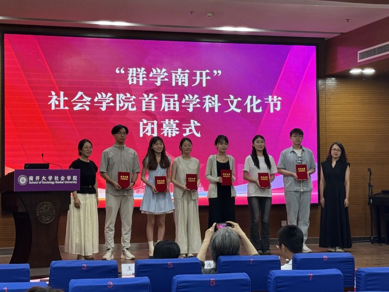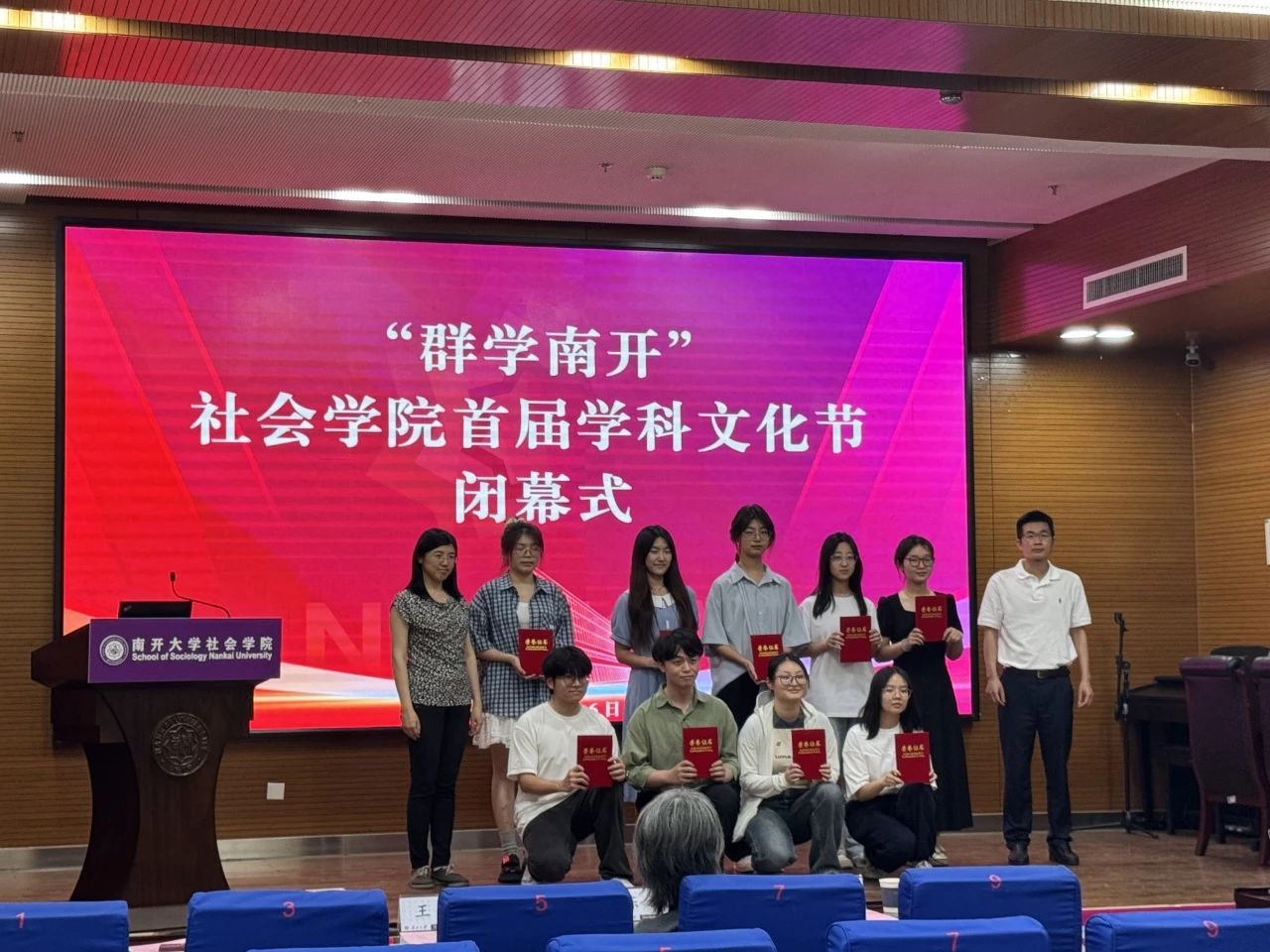 闭幕式上,首先回顾了本届学科文化节开展的系列活动。在历时一个月的文化节中,bevictor1946韦德官网开展了社会学类知识竞赛、社会工作实务案例大赛、社工专业脱口秀、心理小诗征集、心理运动会、群学主题荧光夜跑、劳动教育实践以及社会实践双选会等一系列活动。首届“群学南开”学科文化节得到了公司师生的积极响应,同学们在理论知识学习中碰撞思维火花,在社会实务深耕中感悟社会现实,从专业出发关照社会现实,积极上好了一堂生动的“大思政课”。