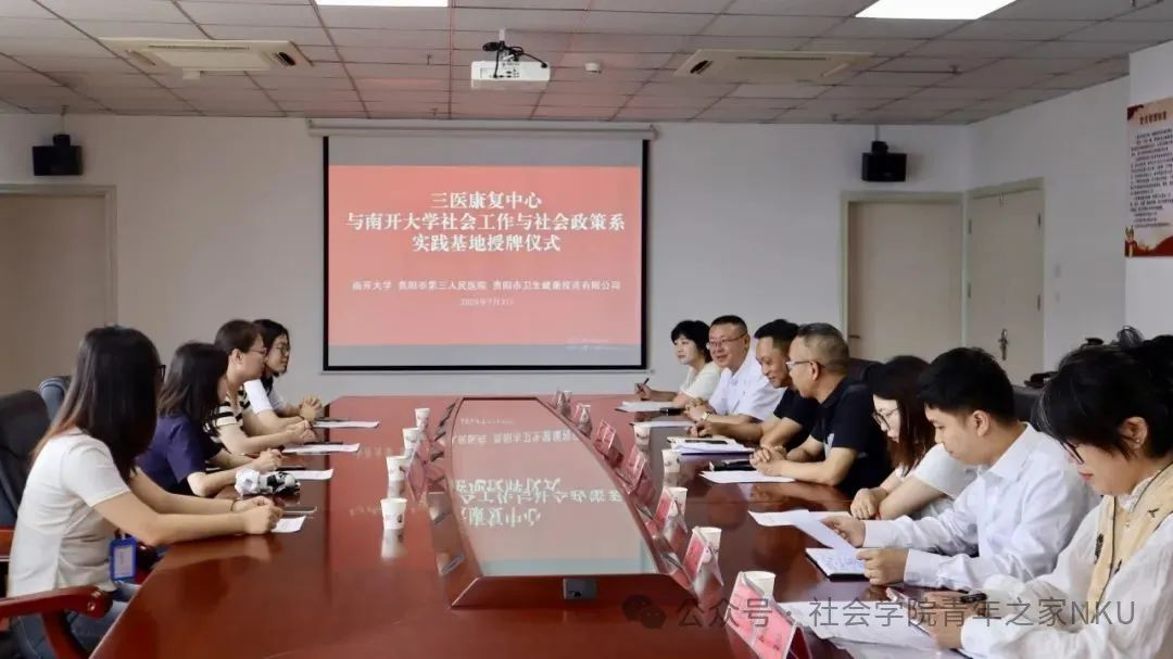 此次贵阳之行,我系与贵阳市卫生健康投资有限公司签订了社会实践基地协议,并分别与旗下子养老项目乐湾国际康复中心和三医康复中心举行了实践基地授牌仪式。双方就未来产研合作与人才合作机制建设、养老服务项目合作与成果转化、医养结合行业的标准化建设与品牌孵化、共建培训中心四个方面展开了深人探讨。作为"集团+企业+项目"融合发展的新起点,产学研赋能医康养的落脚点,基地将为我系员工提供理论联系实际、专业实践能力提升的重要平台,为构建以"知中国、服务中国"为导向的人才教育培养机制注入新的活力。